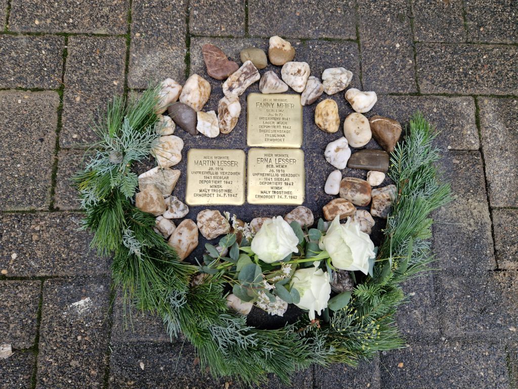 Die Stolpersteine markieren die letzten Wohnorte der Opfer in Troisdorf, bevor sie deportiert und ermordet wurden. Fanny Meier wurde im September 1942 im Vernichtungslager Treblinka getötet. Das Ehepaar Lesser wurde am 20. Juli 1942 von Köln aus deportiert und vermutlich unmittelbar nach der Ankunft im Wald bei Minsk erschossen.