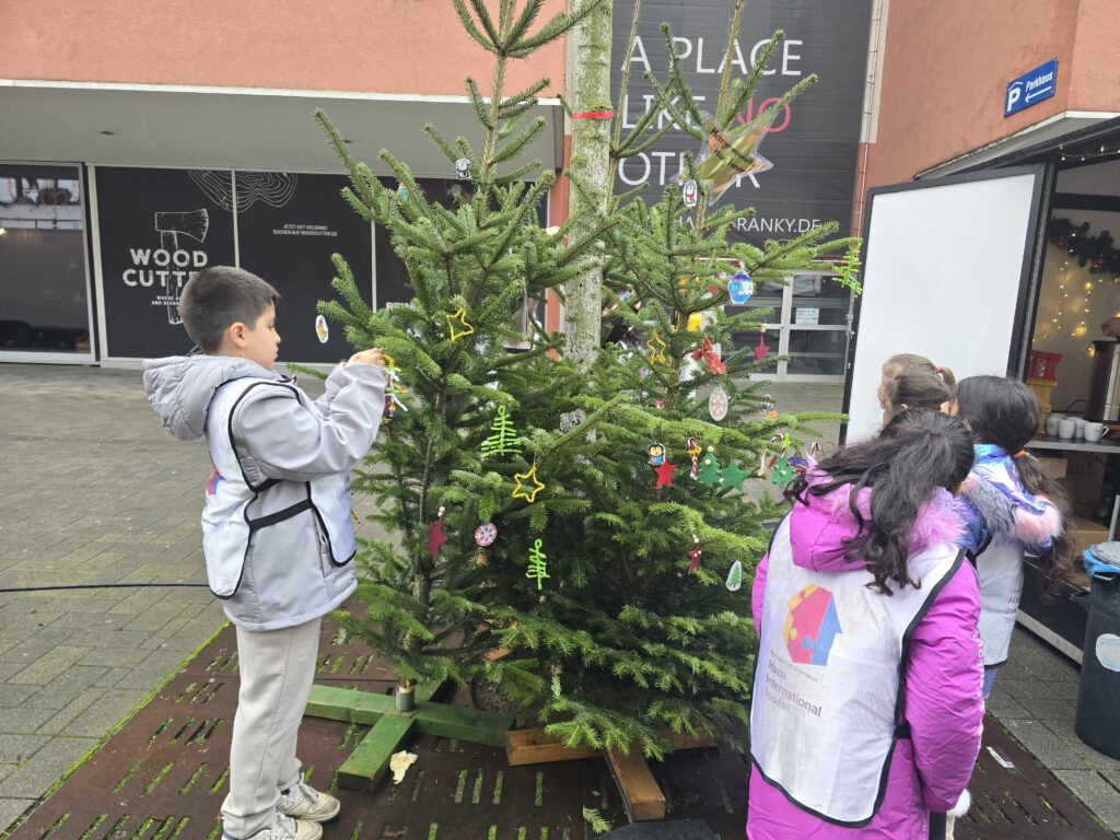 Zuvor hatten sie gemeinsam mit ihren Eltern im Mehrgenerationenhaus farbenfrohen Baumschmuck gebastelt. Am Freitag machten sich die Kinder schließlich gut gelaunt auf den Weg in den Winterwald, um ihren selbstgestalteten Schmuck am eigenen Baum aufzuhängen. Mit internationalen Weihnachtsliedern sorgten sie vor Ort für eine fröhliche Atmosphäre und zauberten vielen Besucherinnen und Besuchern ein Lächeln ins Gesicht. Nach einem kurzen Rundgang durch den Markt ließ die Gruppe den Nachmittag bei warmen Waffeln ausklingen.
