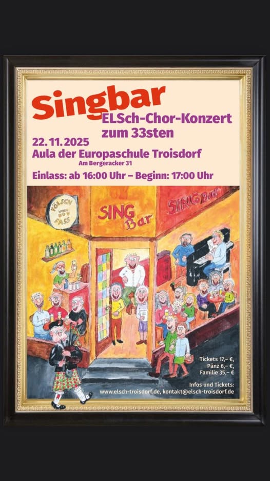 Bitte unbedingt vormerken oder gleich Tickets sichern: 22.11.2025. „Singbar“, 33 Jahre ELSch-Chor Troisdorf! www.elsch-troisdorf.de
