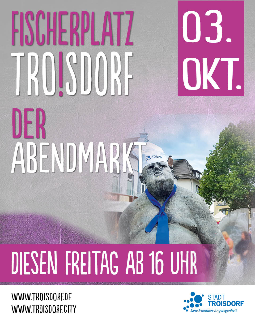 Am Freitag, den 03. Oktober 2025 findet auf dem Fischerplatz in Troisdorf-Mitte zum letzten Mal in dieser Saison der Abendmarkt statt.