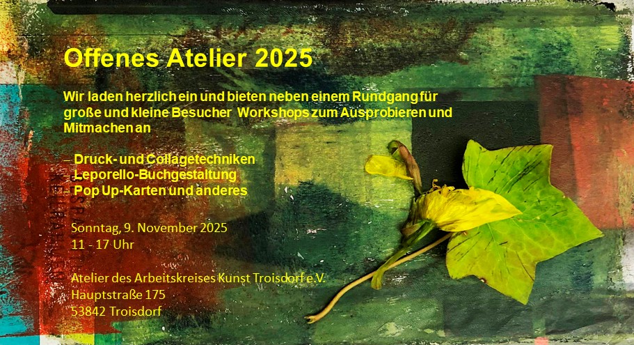Zum Ende des Jubiläumsjahres öffnet der Arbeitskreis Kunst Troisdorf e.V. am Sonntag, dem 9. November 2025, noch einmal seine Türen im Atelier in der Hauptstraße 175 in Troisdorf-Spich.