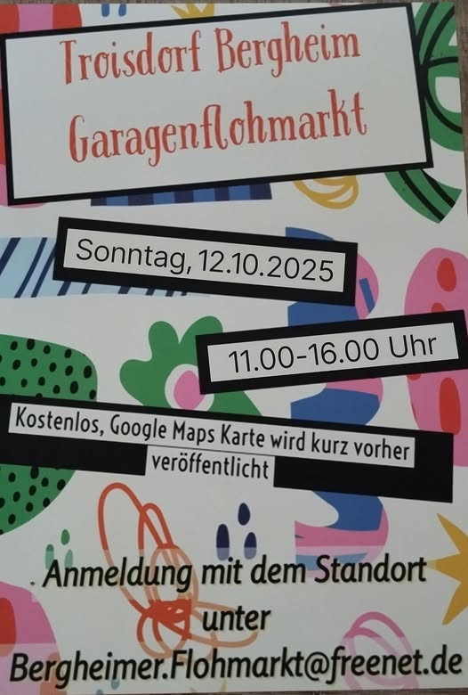Garagenflohmarkt – Bergheim 12. Oktober 2025 treffpunkt Datum/Zeit Date(s) - 12. Oktober 202511:00 - 16:00 Kategorien Sonstiges Garagenflohmarkt gesehen auf facebook am 09. Oktober ’25