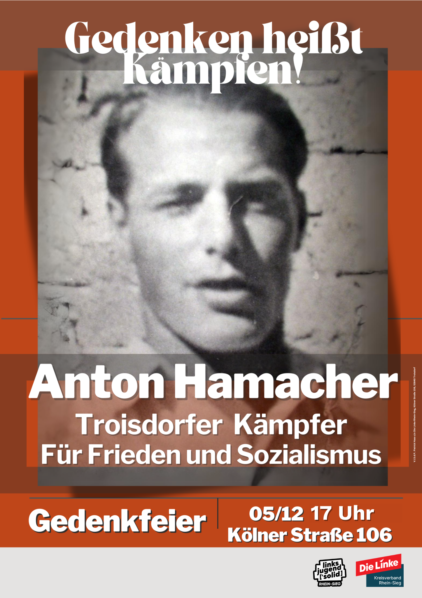 Am Freitag, den 05. Dezember 2025, lädt die Linksjugend Rhein-Sieg ab 17 Uhr in Troisdorf zu einer Gedenkfeier für den kommunistischen Widerstandskämpfer Anton Hamacher ein. Treffpunkt ist am Parteibüro der Partei Die Linke in der Kölner Straße 106.