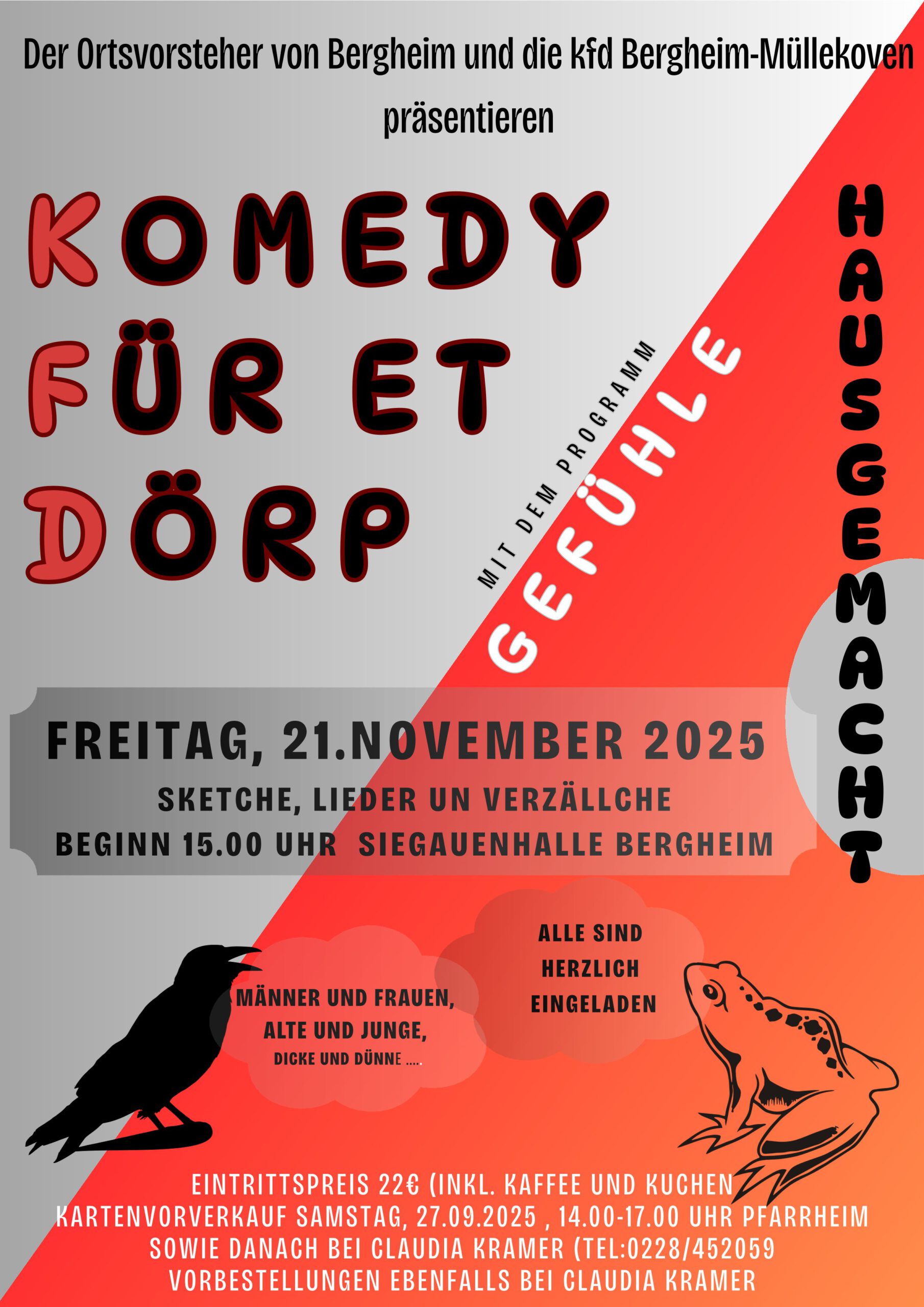 Der Ortsvorsteher von Bergheim Guido Menzenbach und die kfd Bergheim-Müllekoven laden gemeinsam zur Veranstaltung „Komedy für et Dörp“ ein. Am Freitag, 21. November 2025, ab 15 Uhr erwartet die Gäste in der Siegauenhalle Bergheim ein bunter Nachmittag mit Sketchen, Liedern und Verzällcher.