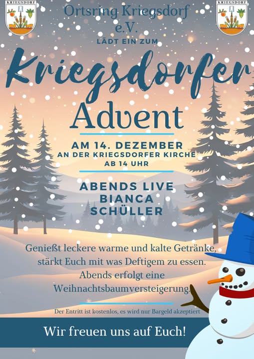Kriegsdorfer Advent 14. Dezember 2025 treffpunkt Datum/Zeit Date(s) - 14. Dezember 202514:00 - 23:15 Veranstaltungsort St. Antonius Kategorien Sonstiges Kriegsdorfer Advent Bitte ausreichend Schnee mitbringen … Aber auch ohne wird es gemütlich werden gesehen auf facebook am 12. Dezember ’25