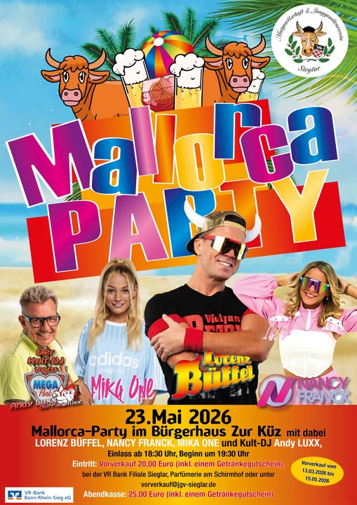Mit dabei: Lorenz Büffel, Mika One, Nancy und DJ Andy Luxx. Der offizielle Vorverkauf startet am 13.03., aber wer schlau ist, sichert sich jetzt schon Tickets per Mail unter vorverkauf@jgv-sieglar.de!