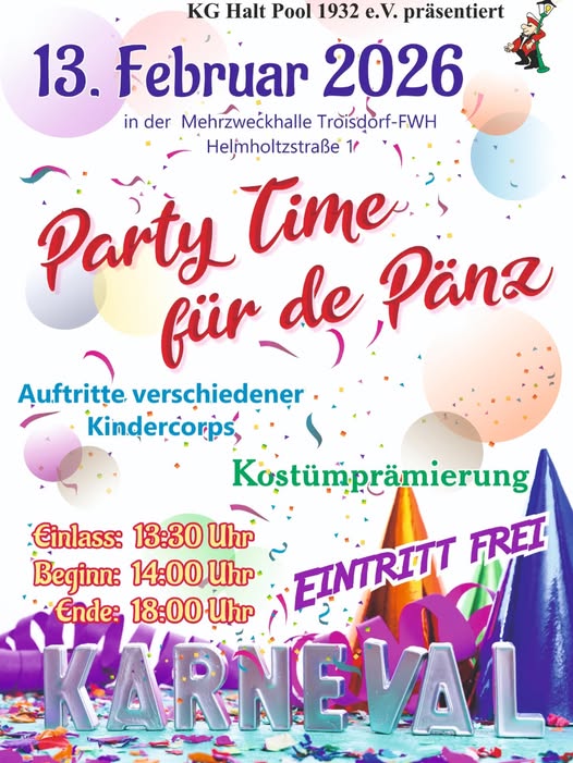 Party Time für de Pänz – FWH 13. Februar 2026 treffpunkt Datum/Zeit Date(s) - 13. Februar 202614:00 - 18:00 Veranstaltungsort Mehrzweckhalle FWH Kategorien Sonstiges Party Time für de Pänz gesehen auf facebook am 26. April ’25 gesehen auf facebook am 14. Januar ’26