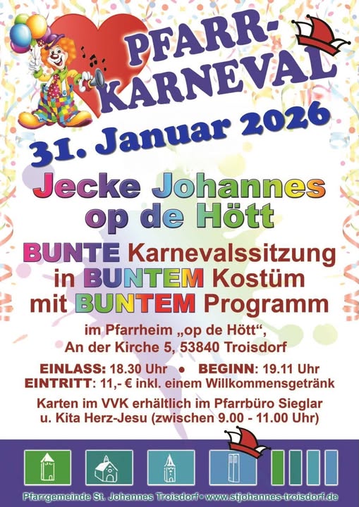 Dieses Jahr findet unser traditioneller Pfarrkarneval am 31. Januar 2026 im Pfarrheim Hütte statt.