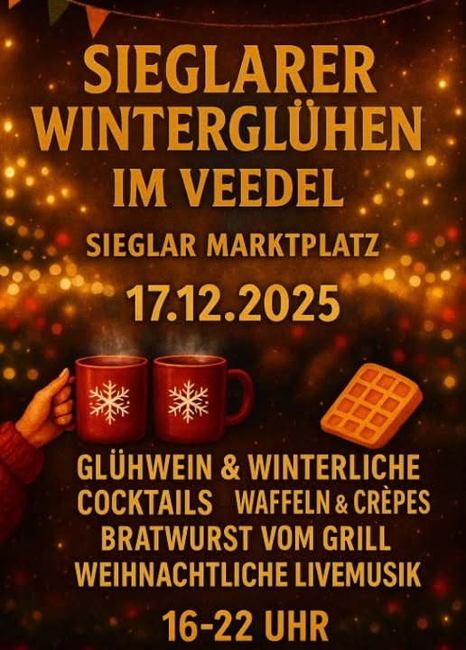 Winterglühen im Veedel – Sieglar 17. Dezember 2025 treffpunkt Datum/Zeit Date(s) - 17. Dezember 202516:00 - 22:00 Veranstaltungsort Marktplatz Sieglar Kategorien Sonstiges Winterglühen im Veedel Winterglühen im Veedel … Kommt vorbei und genießt die vorweihnachtliche Stimmung bei heißem Glühwein und weihnachtlicher Live Musik gesehen auf facebook am 23. November ’25
