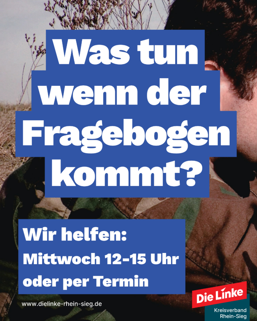 Seit dem 01.01.2026 erhalten junge Menschen Post von der Bundeswehr mit einem Fragebogen zur sog. Wehrerfassung. Die Linke Rhein-Sieg sieht darin einen ersten Schritt zur Wiedereinführung der Wehrpflicht und bietet deshalb jeden Mittwoch von 12 bis 15 Uhr oder nach Terminvereinbarung allen jungen Menschen eine Beratung zum Fragebogen an. Ziel ist es eine umfassende und ehrliche Information zu vermitteln und die Fragen von jungen Menschen rund um die Thematik zu beantworten.