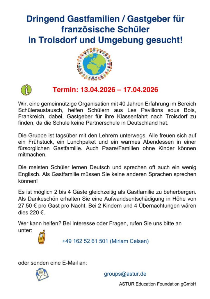 Wer kann helfen? Wir wollen französischen Schülerinnen und Schülern (13–15J.) diesen Frühling eine unvergessliche Zeit in Troisdorf ermöglichen. Dafür sucht die gemeinnützige Organisation ASTUR herzliche Gastgeber in Troisdorf und Umgebung! Die Jugendlichen sind tagsüber mit ihren Lehrern unterwegs und brauchen lediglich ein „Zuhause auf Zeit“ mit Verpflegung. Alle – Rentner/Singles/Paare – können mitmachen. Fremdsprachenkenntnisse sind nicht nötig. Die Kinder zählen auf Sie!