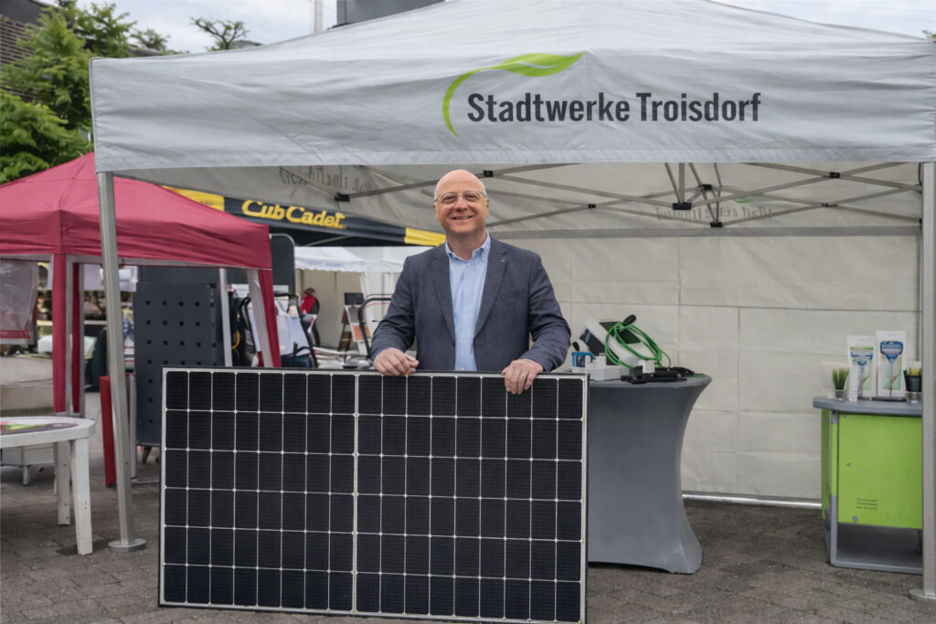 Ein besonderer Fokus liegt in diesem Jahr auf dem Thema Photovoltaik. Interessierte Bürgerinnen und Bürger erhalten am Stand der Stadtwerke Troisdorf umfassende Informationen rund um die eigene Stromerzeugung vom Dach. Von der ersten Idee bis zur fertigen Anlage berät Stadtwerke-Kundenberater Sebastiano Ferro – seit rund 30 Jahren Experte für Photovoltaik – unverbindlich und praxisnah, was im jeweiligen Fall möglich und sinnvoll ist.