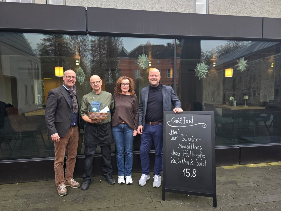 V.l.: Zentrenmanager Stephan Frings (TROWISTA), Eheleute Alexander und Petra Adscheidt (Betreiber Hof Wissem & Hofcafé) sowie Wirtschaftsförderer Tobias Voits am offiziellen Eröffnungstag.