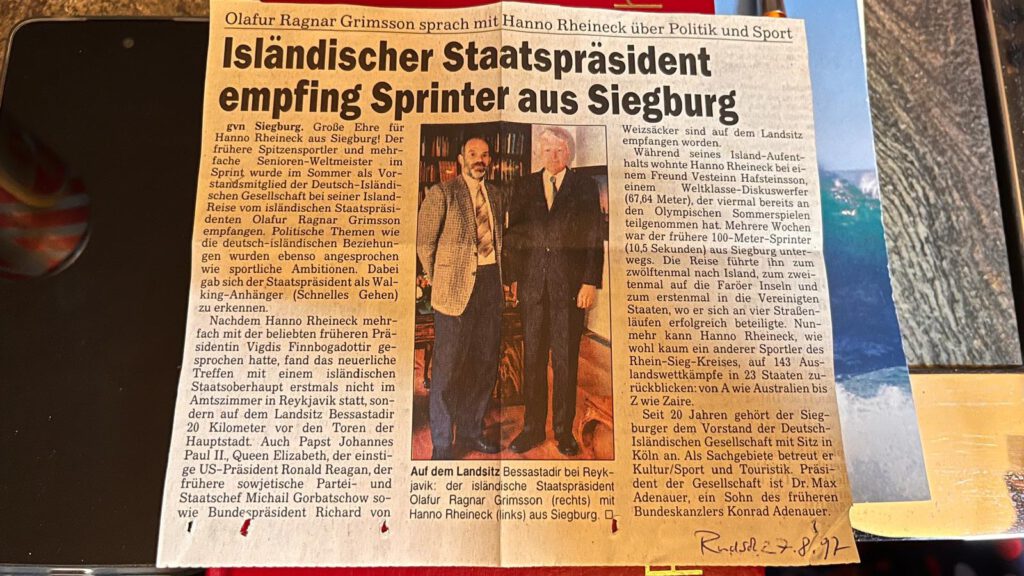 Oskar Thorarensen kam 18 x nach Deutschland -Rheineck “ nur“ 12 x nach Island( zum 1 Mal 1967 ), aber über all die Jahre blieb die Freundschaft bestehen. So feierten die beiden Leichtathlen ( Rheineck ist inzwischen 83 und joggt noch 4x in der Woche ) 4 Tage lang das 50.Jubiläum, besuchten frühere Trainings-und Wettkampfstätten und schwelgten in zahlreichen Erinnerungen und Anekdoten. Oskar Thorarensen überbrachte Grüße von zahlreichen Athleten, die auch mal in Deutschland gewesen waren und Rheineck übergab seinem Freund eine kleine Oskar-Statue mit der Aufschrift “ 1975- 2025, 50 years friendship Oskar und Hanno „