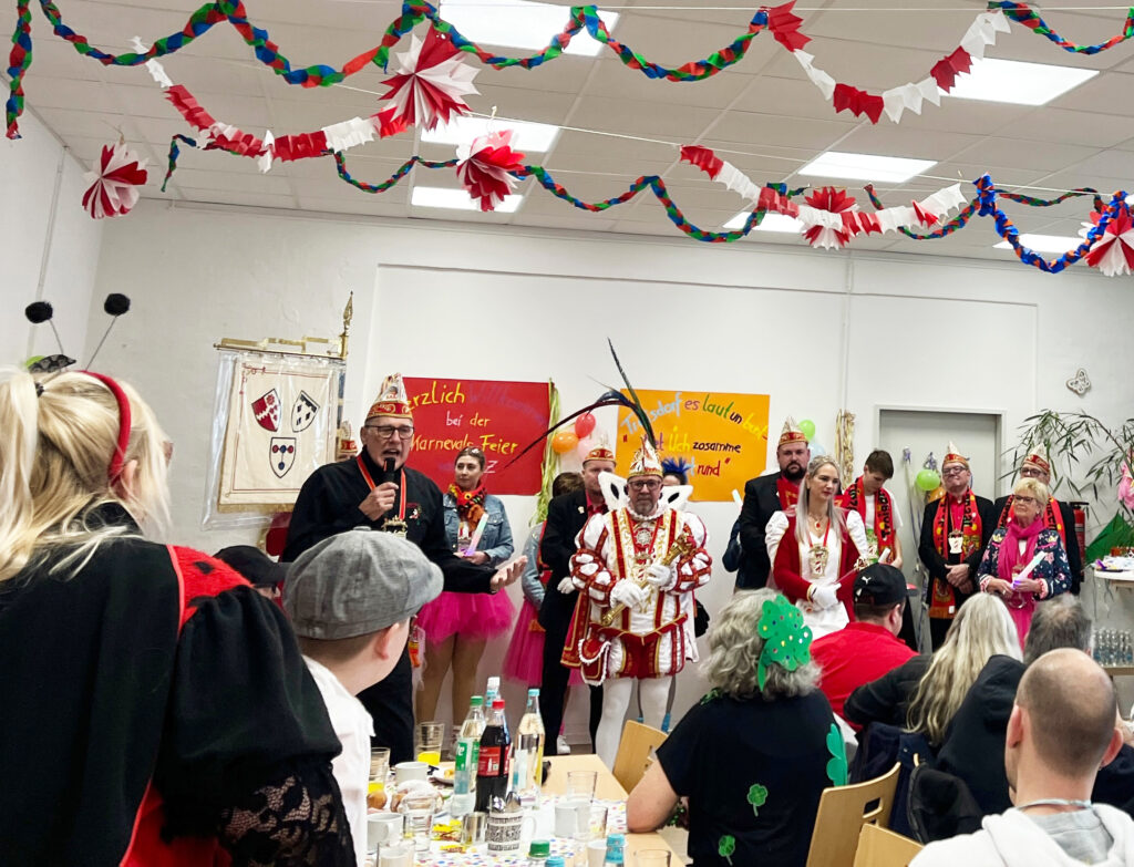 Die eigenen Auftritte brachten in verschiedenen Zusammensetzungen Mitarbeitende, Ehrenamtliche und Besucher*innen des SPZ zusammen. Wie immer im Sitzungskarneval: Singen und Schunkeln ist Pflicht. „Echte Fründe“ gab es zu einem Knietanz. Zu „Oben Unten“ der „Räuber“ tanzten Seniorinnen und Senioren mit einem Fünftklässler, der textsicher und wirklich mitreißend performte.