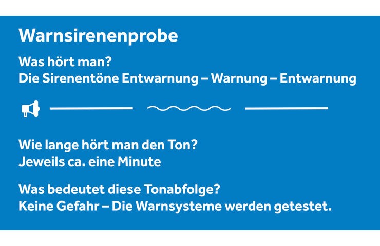 Um 11:00 Uhr wird im gesamten Kreisgebiet der Probealarm mit fast 370 Sirenen durchgeführt: Zunächst ist ein einminütiger, gleichbleibender Ton zu hören (Entwarnung). Daran schließt sich ein einminütiger auf- und abschwellender Ton (Warnung) an. Den Abschluss bildet dann erneut der einminütige, gleichbleibende Ton zur Entwarnung.
