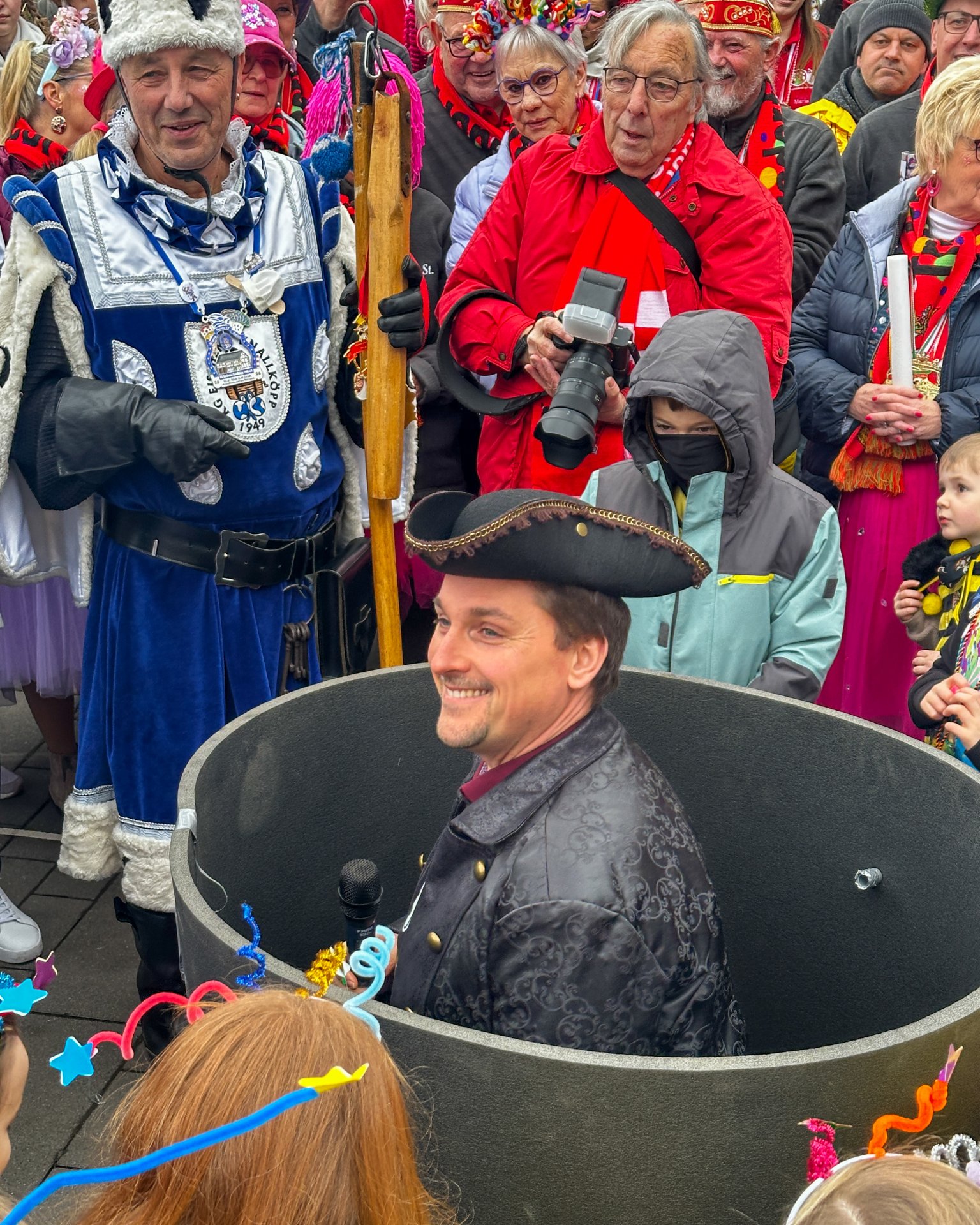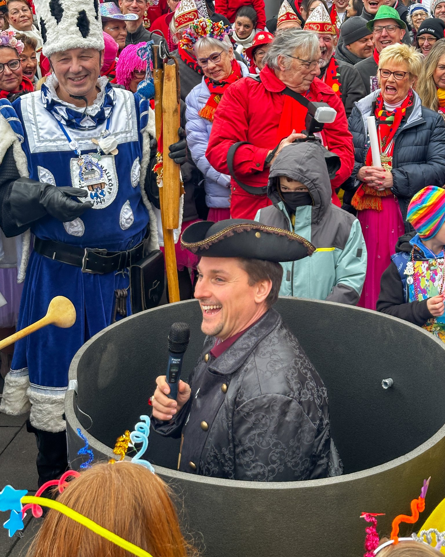 Bürgermeister Alexander Biber wehrte sich tapfer gegen die anrückenden Karnevalisten. Doch alle Ausflüchte und „Säbelrasseln“ halfen nichts – am Ende musste er sich geschlagen geben. Bevor der symbolische Rathausschlüssel den Besitzer wechselte, wurde es für Biber „heiß unterm Hintern“: Bürgermeister Alexander Biber stieg in einen riesigen Suppentopf, in Anspielung auf die von Prinz Guido IV. vorgeschlagene Spezialität „Suppe mit Biber“ oder „Bürgermeistersuppe“. Die Spicher Prinzessin Carmen I. und Spicher Nachwuchs-Karnevalisten steuerten Möhren und Lauch bei. Biber nahm’s mit Humor: „Ich befürchte, das ist diesmal eine dünne Suppe. “