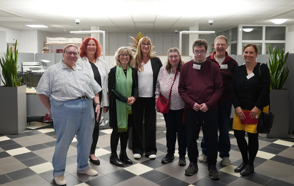Bei der Vernissage kamen die Gäste mit Stadtwerke-Geschäftsführerin Andrea Vogt und den Kunstschaffenden aus Bad Honnef ins Gespräch. Auf dem Foto (v.l.n.r.): Der Kunstschaffende Hans Offer, die Förderbereichsleiterin Monika Lorent, Stadtwerke-Geschäftsführerin Andrea Vogt die Leiterin der Kunstwerkstatt Bärbel Heimann, die Kunstschaffenden Monika Franken, Christian Kloninger  und Holger Hauf sowie die Dozentin Annegret Goebels. Die Ausstellung ist bis zum 7. Januar 2026 in der Stadtwerke-Galerie kostenfrei zu sehen.