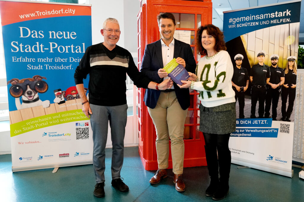 Im Rathaus Troisdorf fand jetzt ein inspirierender Austausch über die Zukunft nachhaltiger Städte statt: Helga Berg, Diplom-Verwaltungswirtin im Bundesministerium für Bildung und Forschung und Künstlerin, sowie Bernhard Schröder, Künstler und Spezialist für das berühmte „Ampelmännchen“, überreichten gemeinsam Bürgermeister Alexander Biber das neu erschienene Fachbuch „Zukunft Stadt: Die globale und lokale Bedeutung von SDG 11* – Wie die sozialökologische Transformation in Wirtschaft und Gesellschaft gelingen kann“.