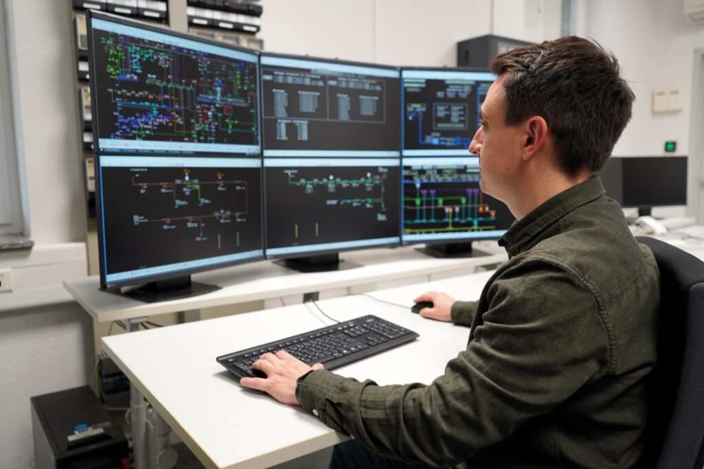 Stadtwerke-Ingenieur Marko Raufuß-Hochstein überwacht in der Leitwarte den Zustand der Netzleitstelle. Über die Monitore kontrolliert er die Echtzeit-Datenübertragung der Außenstandorte an das Leitsystem, die Grundlage der Netzstabilität und Störungserkennung – ein entscheidender Beitrag für eine zuverlässige Energieversorgung.