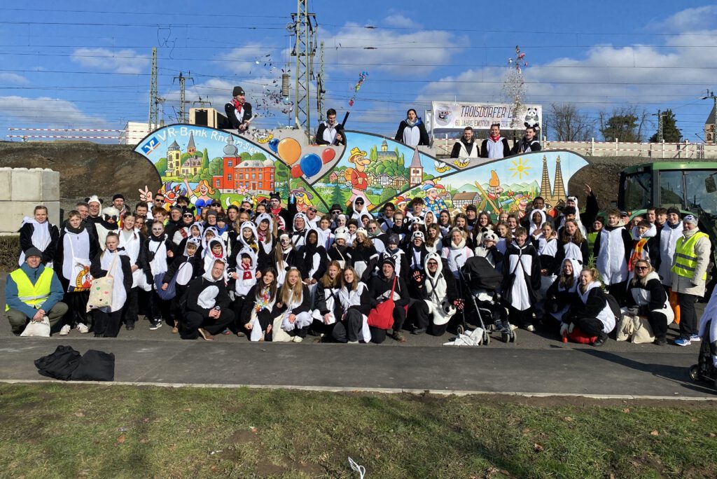 Karnevalssonntag, 8:30 Uhr: Das Team der TLG-Jugend nimmt den Großwagen in Empfang, belädt diesen mit knapp 2 Tonnen Süßigkeiten, verstaut die Technik und alles, was dazugehört. Anschließend wird der Großwagen von unserem Traktor (an dieser Stelle ein riesengroßes Dankeschön!) abgeholt und zum Aufstellplatz gebracht. Hier wird alles sortiert und verkabelt und der Generator gestartet. Um 13 Uhr sind dann alle 100 TLG’ler:innen abmarschbereit. Fast 4 Stunden ziehen die TLG-Pandas durch Troisdorfs Straßen. Um 18 Uhr – kurz vor dem einsetzenden Schnee – ist alles vorbei. Fest steht: wir hatten Spaß und unser Motto wurde erneut gelebt. Wir sind „60 Jahre Emotion. 100% Zukunft!“