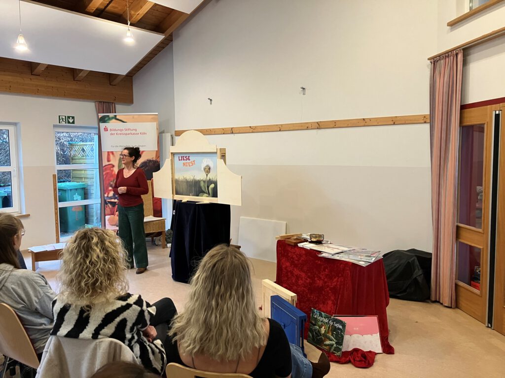 Für Erzieherinnen und Erzieher aus Kitas im Rhein-Erft-Kreis, dem Rheinisch-Bergischen Kreis und dem Oberbergischen Kreis fanden in Kooperation mit dem Verein „eineARThaus e.V.“ bereits drei Fortbildungen zur Anwendung des japanischen Kamishibai-Erzähltheaters (Theater in einem Holzrahmen mit Bildkarten zum Einschieben und Wechseln) statt mit dem Ziel, kindliche Sprachbildung über das freie und dialogische Erzählen zu fördern. Eine weitere Fortbildung für Erzieher und Erzieherinnen in Kitas aus dem Rhein-Sieg-Kreis ist im Januar 2026 geplant.