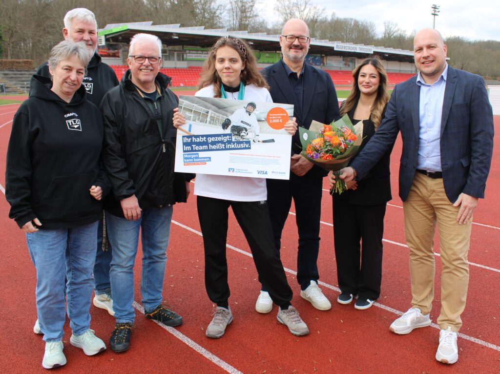 Die VR-Bank Bonn Rhein-Sieg eG hat im Rahmen des bundesweiten Wettbewerbs „Visa feiert Inklusion durch Sport. Wir auch!“ der Troisdorfer Leichtathletik-Gemeinschaft TLG im Aggerstadion einen symbolischen Spendenscheck über 2.000 Euro überreicht.